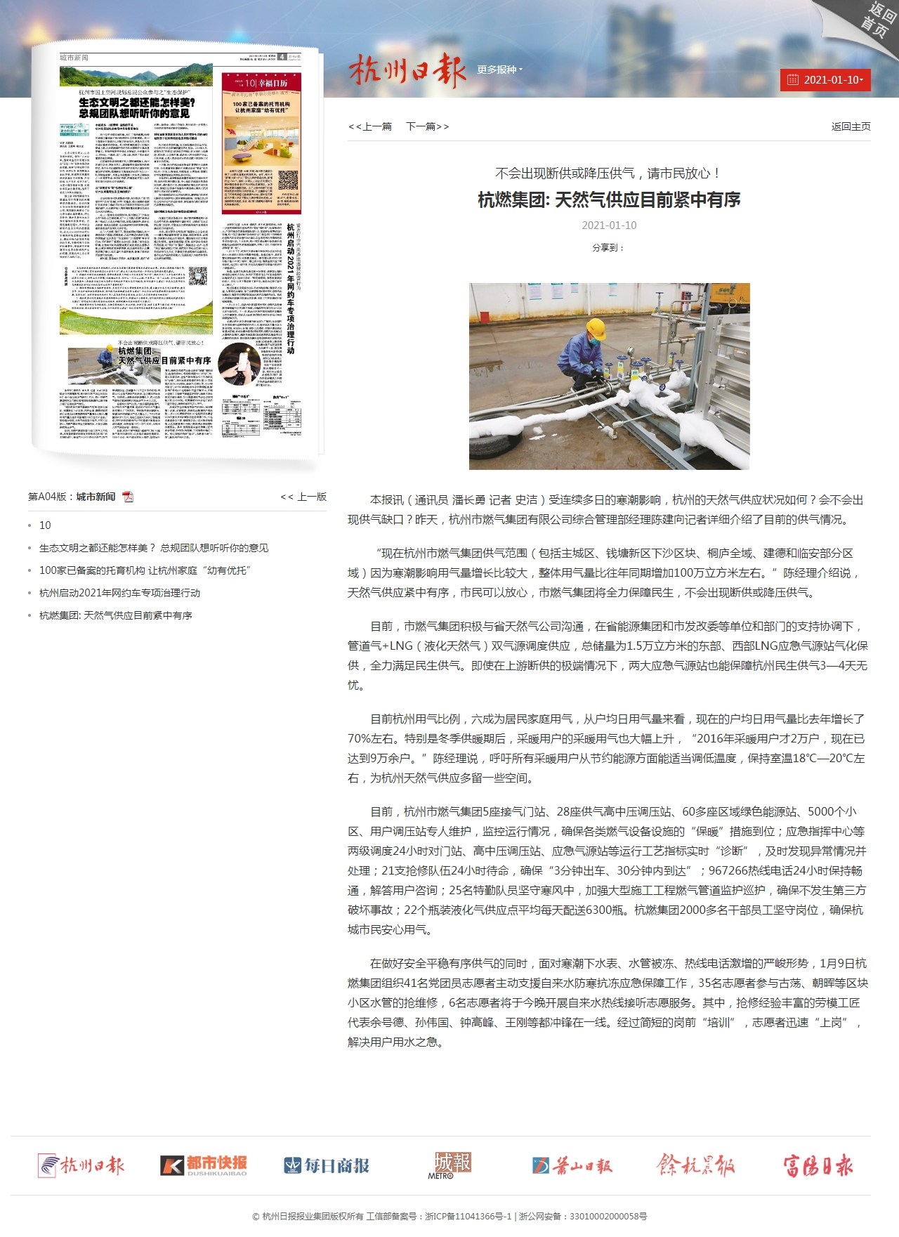 目前,市欧美成人视频 积极与省天然气公司沟通,在省能源集团和市发改委等单位和部门的支持协调下,管道气+LNG(液化天然气)双气源调度供应,总储量为1.5万立方米的东部、西部LNG应急气源站气化保供,全力满足民生供气。即使在上游断供的极端情况下,两大应急气源站也能保障杭州民生供气3—4天无忧。