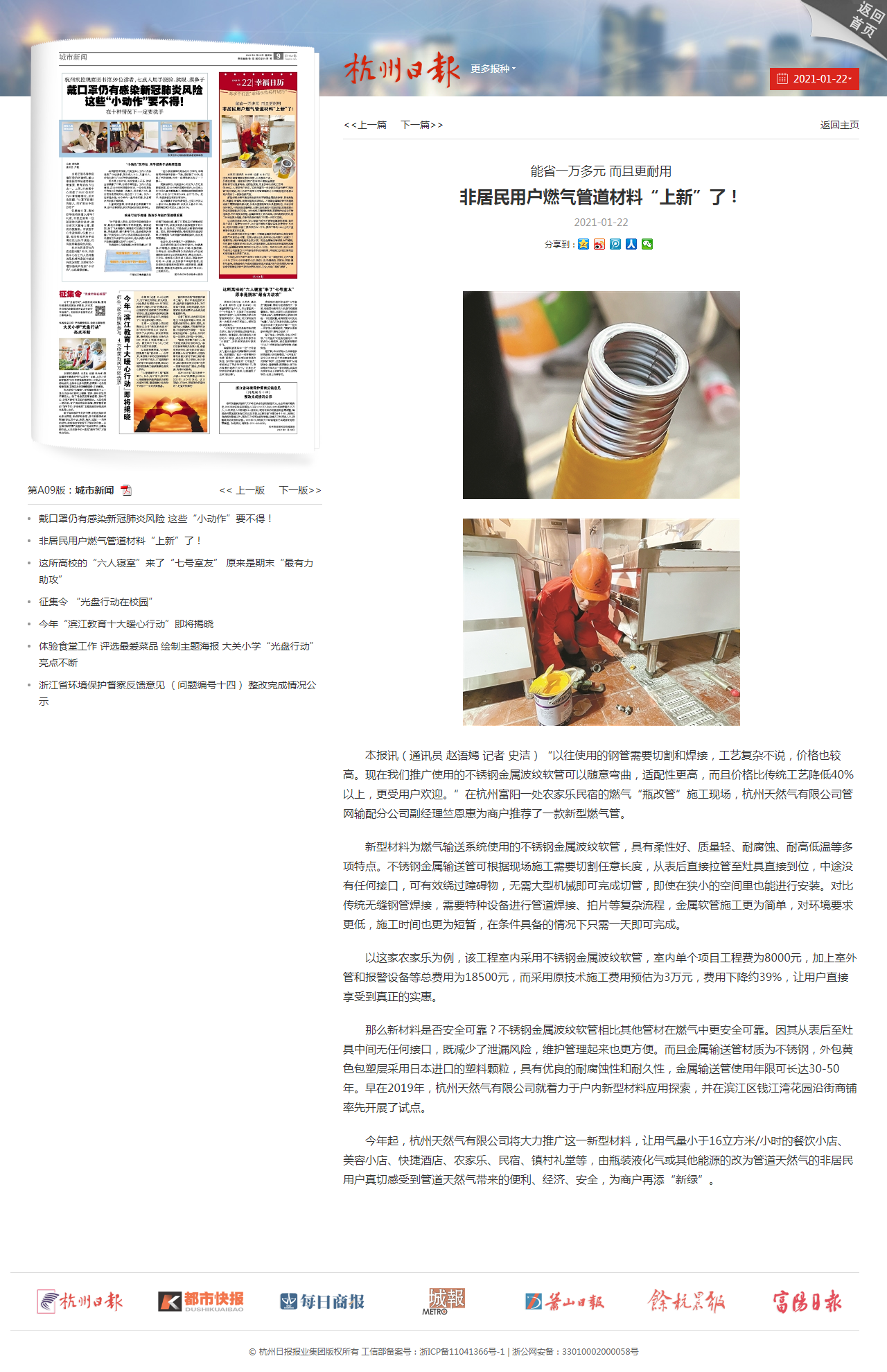 那么新材料是否安全可靠?不锈钢金属波纹软管相比其他管材在燃气中更安全可靠。因其从表后至灶具中间无任何接口,既减少了泄漏风险,维护管理起来也更方便。而且金属输送管材质为不锈钢,外包黄色包塑层采用日本进口的塑料颗粒,具有优良的耐腐蚀性和耐久性,金属输送管使用年限可长达30-50年。早在2019年,杭州天然气有限公司就着力于户内新型材料应用探索,并在滨江区钱江湾花园沿街商铺率先开展了试点。