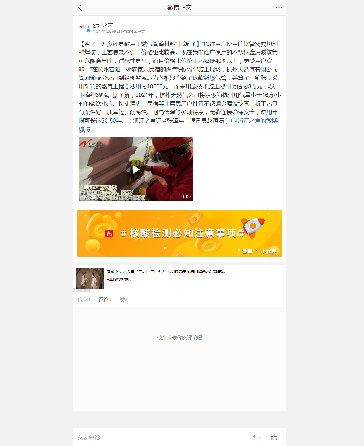 “以往用户使用的钢管需要切割和焊接,工艺复杂不说,价格也比较高。现在我们推广使用的不锈钢金属波纹管可以随意弯曲,适配性更高,而且价格比传统工艺降低40%以上,更受用户欢迎。”在杭州富阳一处农家乐民宿的燃气“瓶改管”施工现场,杭州天然气有限公司管网输配分公司副经理竺恩惠为老板娘介绍了这款新燃气管,并算了一笔账:采用新管的燃气工程总费用为18500元,而采用原技术施工费用预估为3万元,费用下降约39%。据了解,2021年,杭州天然气公司将积极为杭州用气量小于16方/小时的餐饮小店、快捷酒店、民宿等非居民用户推行不锈钢金属波纹管。新工艺具有柔性好、质量轻、耐腐蚀、耐高低温等多项特点,无缝连接确保安全,使用年限可长达30-50年。