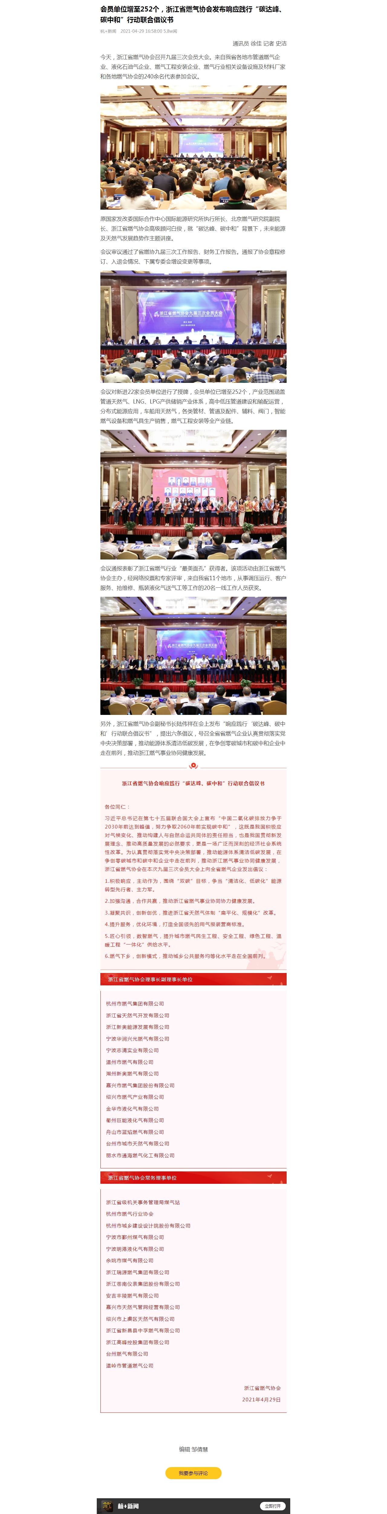 另外,浙江省燃气协会副秘书长陆伟祥在会上发布“响应践行‘碳达峰、碳中和’行动联合倡议书”,提出六条倡议,号召全省省燃气企业认真贯彻落实党中央决策部署,推动能源体系清洁低碳发展,在争创零碳城市和碳中和企业中走在前列,推动浙江燃气事业协同健康发展。