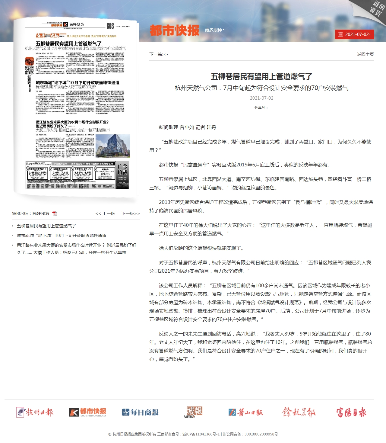 对于五柳巷居民的呼声,杭州天然气有限公司日前给出明确的回应:“五柳巷区域通气问题已列入我公司2021年为民办实事项目,着力攻坚破难。”