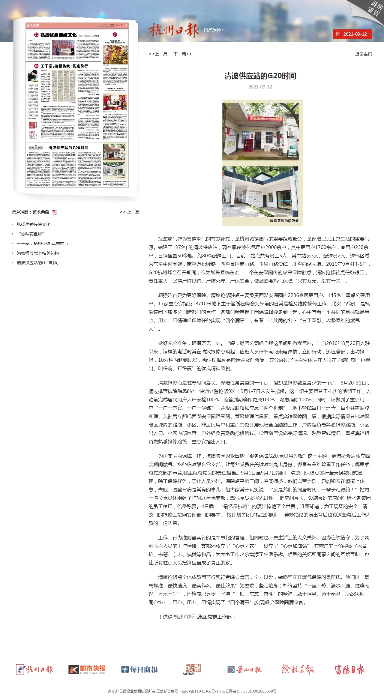 瓶装燃气作为管道燃气的有效补充,是杭州城镇燃气的重要组成部分,是保障居民正常生活的重要气源。始建于1979年的清波供应站,现有瓶装液化气用户2000余户,其中民用户1700余户,商用户230余户,日销售量50余瓶,约80%配送上门。目前,站点共有员工5人,其中站员3人、配送员2人。送气区域为东至中河高架,南至万松岭路,西至景区南山路、玉皇山路沿线,北至西湖大道。2016年9月4日-5日,G20杭州峰会召开期间,作为城投系统在唯一一个在安保圈内的应急保障驻点,清波抢修驻点任务艰巨,责任重大,坚持严阵以待、严防死守、严保安全,做到峰会燃气保障“只有万无、没有一失”。