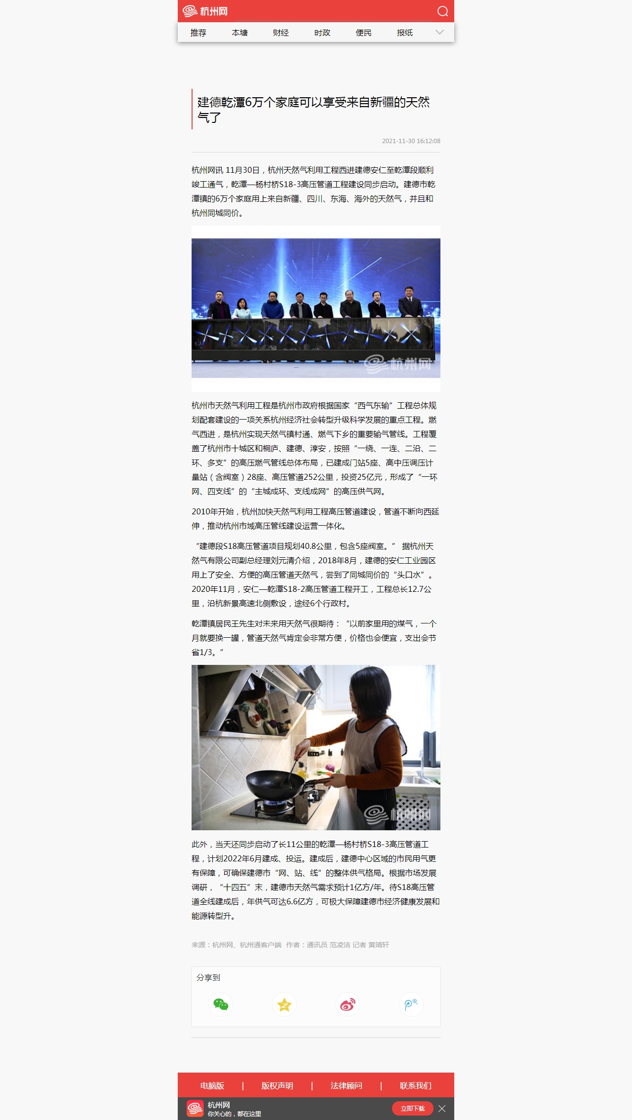 此外,当天还同步启动了长11公里的乾潭—杨村桥S18-3高压管道工程,计划2022年6月建成、投运。建成后,建德中心区域的市民用气更有保障,可确保建德市“网、站、线”的整体供气格局。根据市场发展调研,“十四五”末,建德市天然气需求预计1亿方/年。待S18高压管道全线建成后,年供气可达6.6亿方,可极大保障建德市经济健康发展和能源转型升。