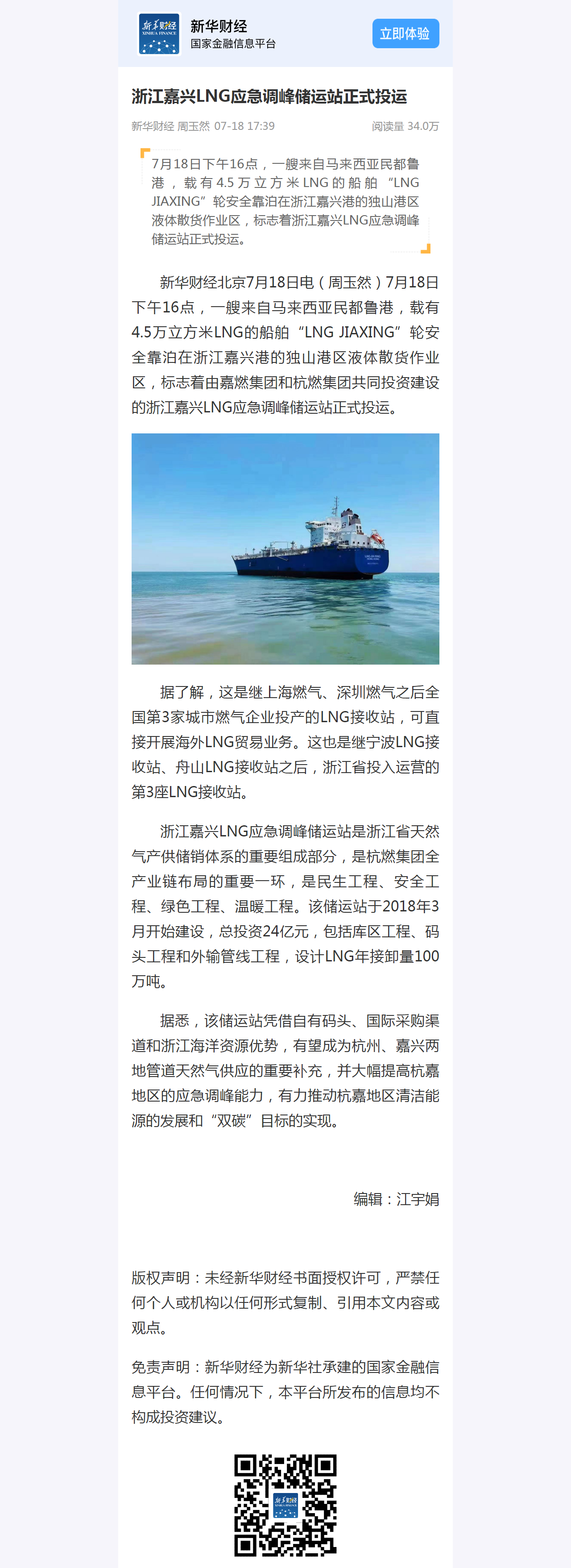 新华财经北京7月18日电(周玉然)7月18日下午16点,一艘来自马来西亚民都鲁港,载有4.5万立方米LNG的船舶“LNG JIAXING”轮安全靠泊在浙江嘉兴港的独山港区液体散货作业区,标志着由嘉燃集团和欧美成人视频 共同投资建设的浙江嘉兴LNG应急调峰储运站正式投运。
