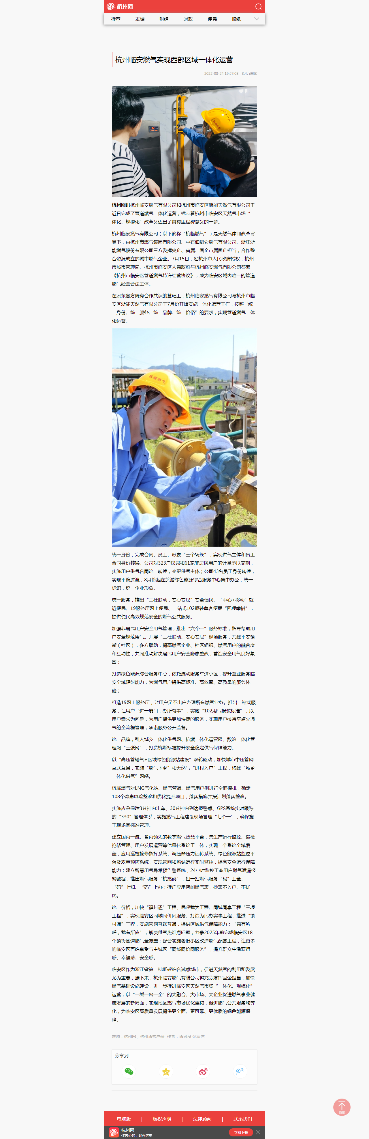 在股东各方既有合作共识的基础上,杭州临安燃气有限公司与杭州市临安区浙能天然气有限公司于7月份开始实施一体化运营工作,按照“统一身份、统一服务、统一品牌、统一价格”的要求,实现管道燃气一体化运营。