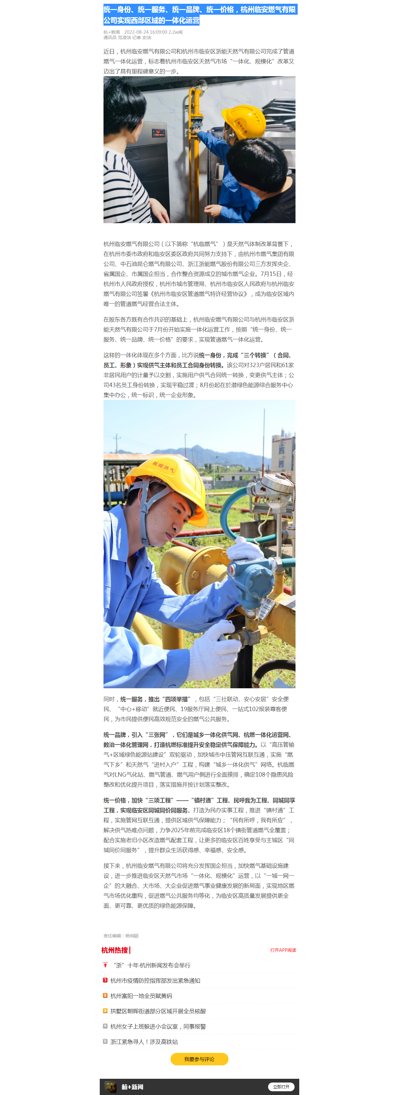 在股东各方既有合作共识的基础上,杭州临安燃气有限公司与杭州市临安区浙能天然气有限公司于7月份开始实施一体化运营工作,按照“统一身份、统一服务、统一品牌、统一价格”的要求,实现管道燃气一体化运营。