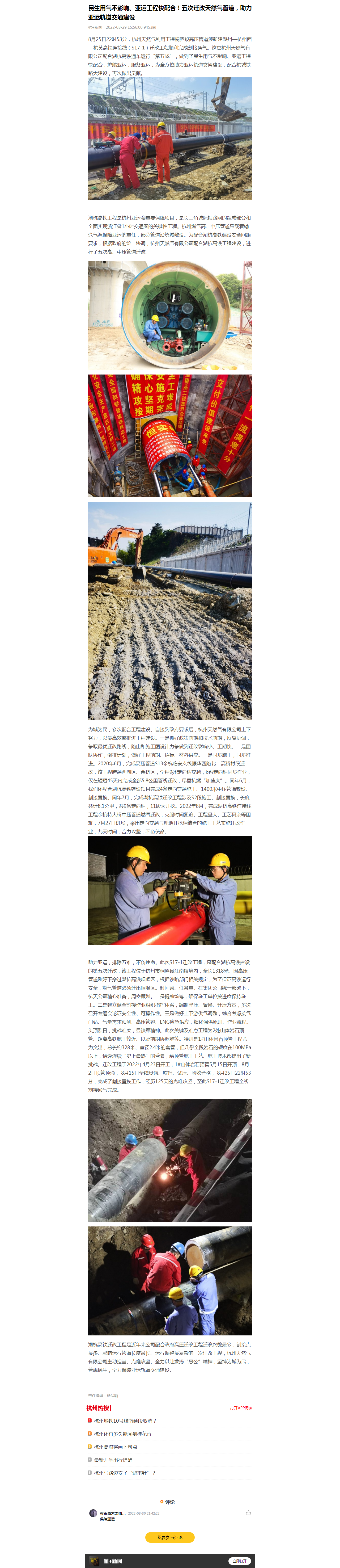 助力亚运,排除万难,不负使命。此次S17-1迁改工程,是配合湖杭高铁建设的第五次迁改,该工程位于杭州市桐庐县江南镇境内,全长1318米。因高压管道刚好下穿过湖杭高铁咽喉区,根据铁路部门相关规定,为了保证高铁运行安全,燃气管道必须迁出咽喉区。时间紧、任务重。在集团公司统一部署下,杭天公司精心准备,周密策划。一是提前统筹,确保施工单位按进度保持施工。二是建立健全割接作业组织指挥体系,编制降压、置换、升压方案,多次召开专题会论证安全性、可操作性。三是做好上下游供气调整,综合考虑接气门站、气量需求预测、高压管容、LNG应急供应,细化保供原则、作业流程。头顶烈日,挑战难度,显铁军精神。此次关键及难点工程为2处山体岩石顶管、距离高铁施工较近、以及前期协调难等。特别是1#山体岩石顶管工程尤为突出,总长约328米、直径2.4米的套管,但几乎全段岩石的硬度在100MPa以上,恰逢连续“史上最热”的盛夏,给顶管施工工艺、施工技术都提出了新挑战。迁改工程于2022年4月23日开工,1#山体岩石顶管5月15日开顶,8月2日顶管顶通, 8月15日全线贯通、吹扫、试压、验收合格, 8月25日22时53分,完成了割接置换工作,经历125天的克难攻坚,至此S17-1迁改工程全线割接通气完成。