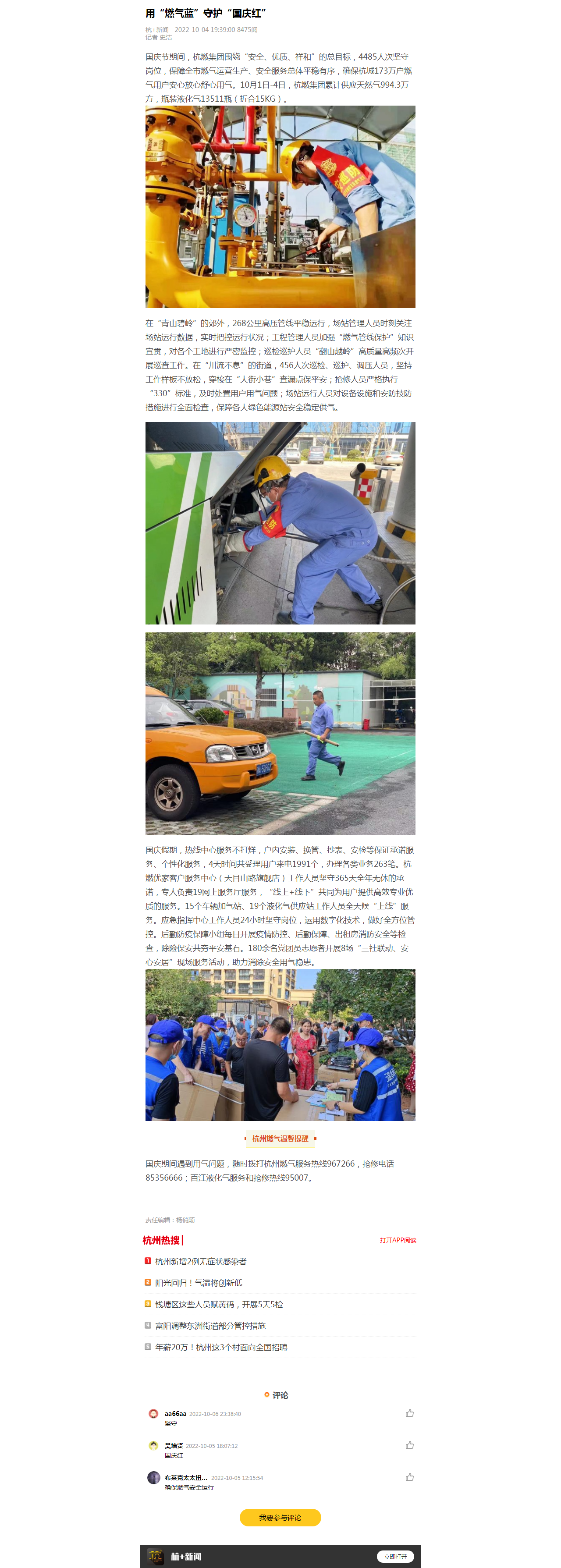 国庆假期,热线中心服务不打烊,户内安装、换管、抄表、安检等保证承诺服务、个性化服务,4天时间共受理用户来电1991个,办理各类业务263笔。杭燃优家客户服务中心(天目山路旗舰店)工作人员坚守365天全年无休的承诺,专人负责19网上服务厅服务,“线上+线下”共同为用户提供高效专业优质的服务。15个车辆加气站、19个液化气供应站工作人员全天候“上线”服务。应急指挥中心工作人员24小时坚守岗位,运用数字化技术,做好全方位管控。后勤防疫保障小组每日开展疫情防控、后勤保障、出租房消防安全等检查,除险保安共夯平安基石。180余名党团员志愿者开展8场“三社联动、安心安居”现场服务活动,助力消除安全用气隐患。
