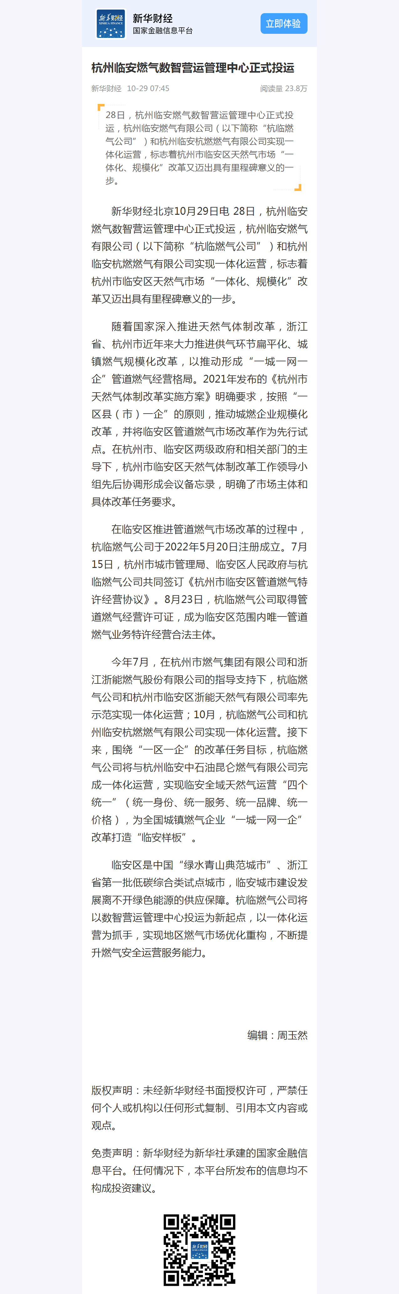 有限公司和浙江浙能燃气股份有限公司的指导支持下,杭临燃气公司和杭州市临安区浙能天然气有限公司率先示范实现一体化运营;10月,杭临燃气公司和杭州临安杭燃燃气有限公司实现一体化运营。接下来,围绕“一区一企”的改革任务目标,杭临燃气公司将与杭州临安中石油昆仑燃气有限公司完成一体化运营,实现临安全域天然气运营“四个统一”(统一身份、统一服务、统一品牌、统一价格),为全国城镇燃气企业“一城一网一企”改革打造“临安样板”。