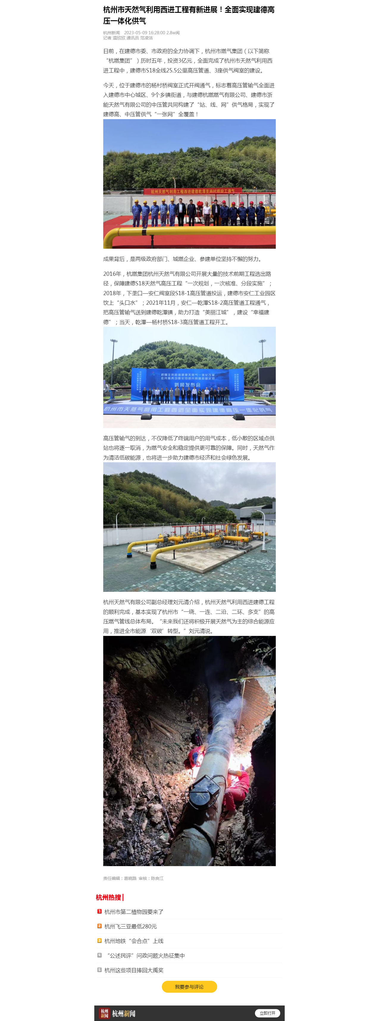 杭州天然气有限公司副总经理刘元清介绍,杭州天然气利用西进建德工程的顺利完成,基本实现了杭州市“一绕、一连、二沿、二环、多支”的高压燃气管线总体布局。“未来我们还将积极开展天然气为主的综合能源应用,推进全市能源‘双碳’转型。”刘元清说。