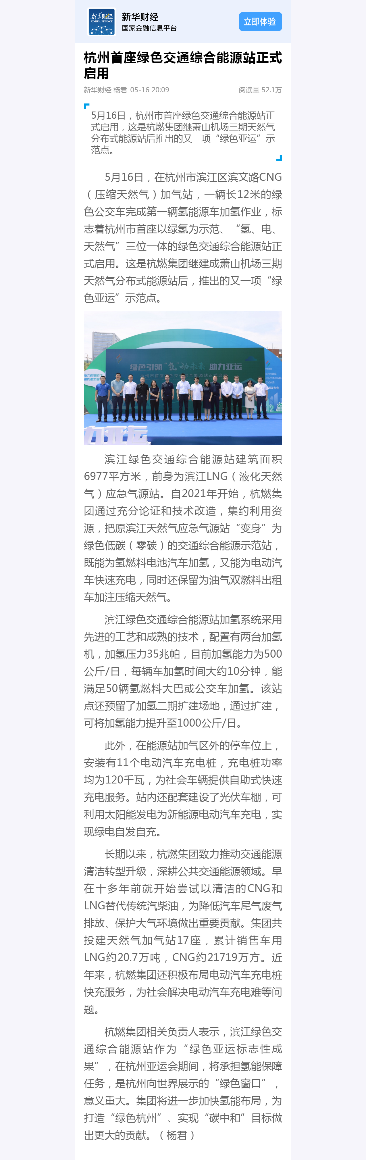 5月16日,在杭州市滨江区滨文路CNG(压缩天然气)加气站,一辆长12米的绿色公交车完成第一辆氢能源车加氢作业,标志着杭州市首座以绿氢为示范、“氢、电、天然气”三位一体的绿色交通综合能源站正式启用。这是欧美成人视频 继建成萧山机场三期天然气分布式能源站后,推出的又一项“绿色亚运”示范点。