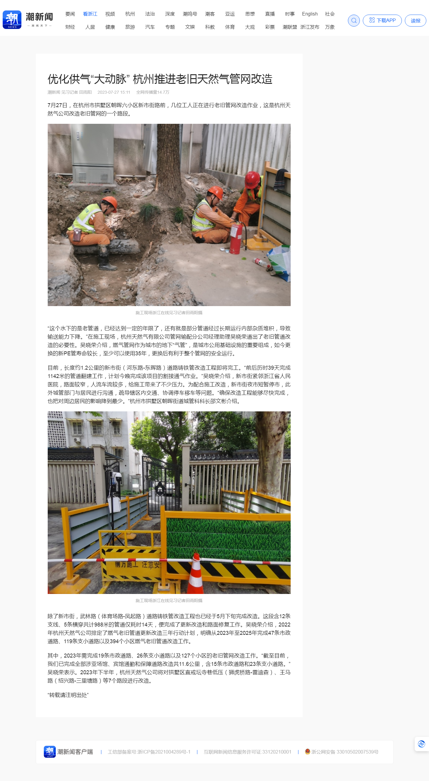 7月27日,在杭州市拱墅区朝晖六小区新市街路前,几位工人正在进行老旧管网改造作业,这是杭州天然气公司改造老旧管网的一个路段。