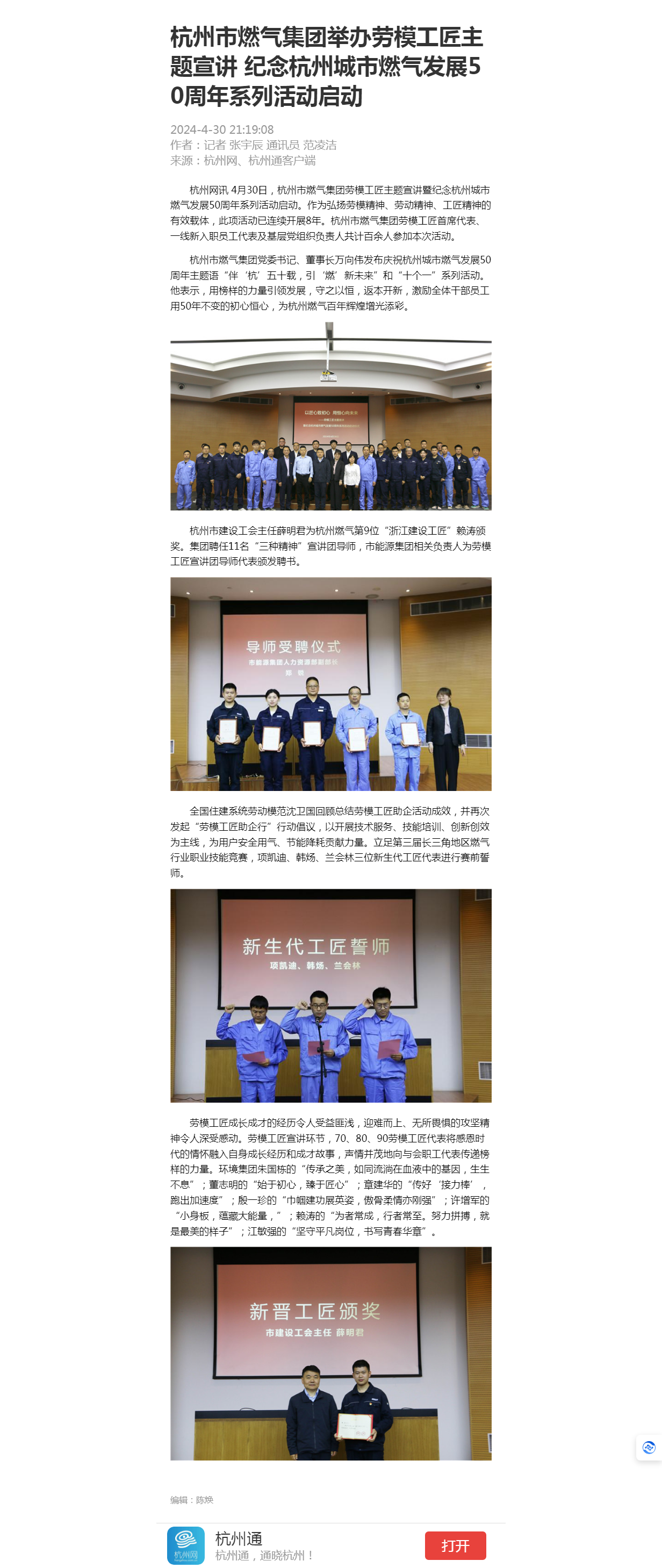 杭州网讯 4月30日,欧美成人视频 劳模工匠主题宣讲暨纪念杭州城市燃气发展50周年系列活动启动。作为弘扬劳模精神、劳动精神、工匠精神的有效载体,此项活动已连续开展8年。欧美成人视频 劳模工匠首席代表、一线新入职员工代表及基层党组织负责人共计百余人参加本次活动。