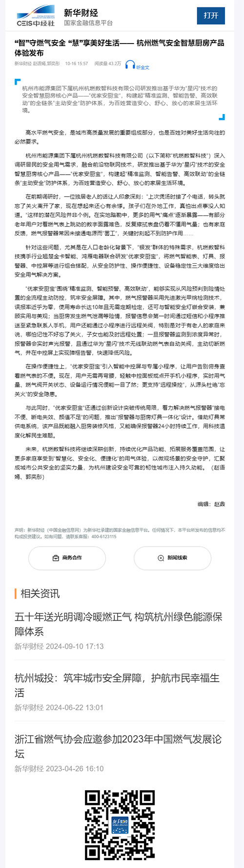 “优家安厨宝”围绕“精准监测、智能预警、高效联动”,能够实现从风险预判到险情处置的全流程主动防控,筑牢安全屏障。其中,燃气报警器采用先进激光甲烷检测技术,误报率近乎为零,使用寿命长达10年且无需定期检定,还可与智能安全灯嵌合安装,兼顾实用与美观;当厨房发生燃气泄漏等险情,报警信息会第一时间通过短信和小程序推送至紧急联系人手机,用户还能通过小程序进行远程关阀,特别是对于有老人的家庭来说,哪怕记性不好忘了关火,子女也能及时远程处置;一旦报警器监测到浓度异常时,报警器会实时声光报警,且通过华为“星闪”技术无线联动燃气表自动关阀,主动切断燃气,并在中控屏上实现弹框告警,快速降低风险。