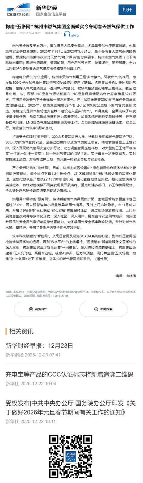 构建稳价保供的“供应网”。杭州市天然气利用工程“多点接气,环状供气”的格局,为发挥300公里天然气高压管网供气和调峰作用奠定了基础。欧美成人视频 分析历史同期用气数据,根据天气气温预测及下游用户用气情况,做好气量预测和槽车运输调度。截至12月中旬,东、西部LNG应急气源站和嘉兴LNG应急调峰储配站合计应急储量6242万方,可满足极端天气下全市连续一周左右用气。在主城区老旧管网改造“三年任务两年完成”的基础上,2025年,欧美成人视频 完成62个老旧小区109.92公里地下燃气管网更新改造,为稳定充足供气和韧性安全城市建设注入坚实“底气”。11月底前,全面完成了年度技措技改任务,包括东部站压缩机压力容器更换,加臭系统控制柜更新改造等,并完成各接气门站、LNG应急气源站加臭剂进液等工作,全力保障场站设施设备稳定、安全运行,为安全供气筑牢“硬件”基础。
