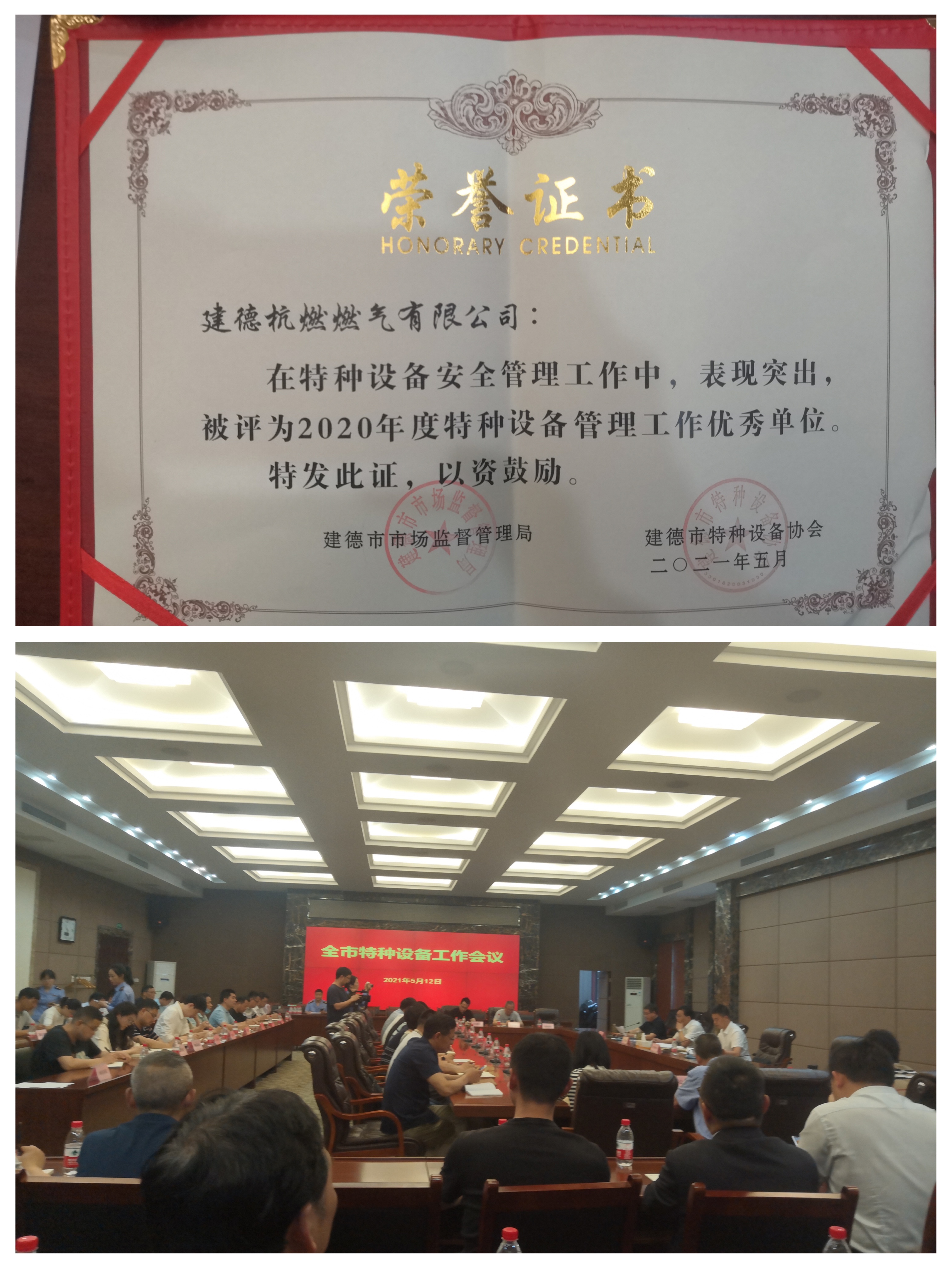 2021年5月12日,建德市人民政府办公室组织召开《建德市特种设备安全工作会议》,会上对二〇二〇年特种设备管理工作优秀单位进行表彰,建德公司被评为二〇二〇年度特种设备管理工作优秀单位,这也是建德公司首次被评为特种设备管理工作优秀单位。