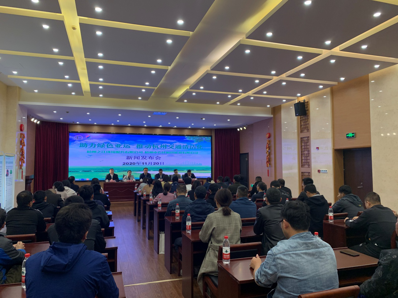 2020年11月20日上午10:00,杭州中石化杭燃能源有限公司与江干区环境卫生服务中心共同召开了以“助力绿色亚运 推动杭州交通清洁化”为主题的新闻发布会。杭州市江干区城管局正处级党委委员陈新、市城市管理局环境卫生和生活固废处置保障中心环卫科科长庄琦、市生态环境局大气处科长姜衡、之江环境服务有限公司总经理伞志强等相关领导和杭州二台、杭州日报、都市快报、钱江晚报等新闻媒体记者出席了本次新闻发布会。
