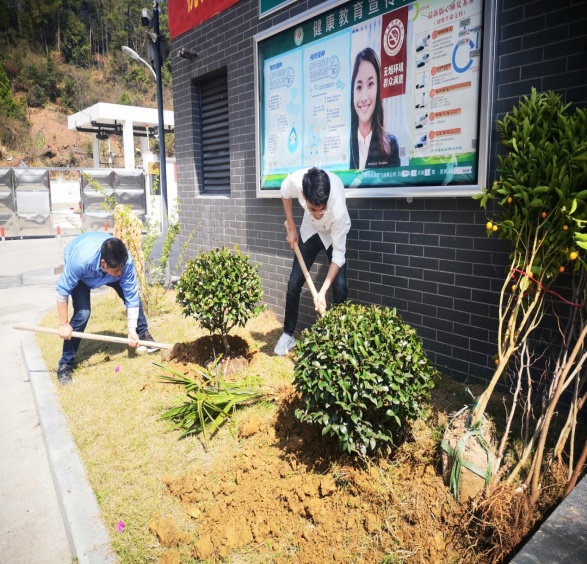 3月15日下午,在卢怀同志带领下,淳安公司全体党员、骨干员工、青年志愿者,在丰家山场站周边绿化带,大家挽起衣袖、卷起裤脚、拿起锄头、弯腰劳作,用锄头挖好一个个坑,将花卉苗木分门别类的依次放入,培好土,再悉心地用水全部浇灌一边。除了个别有经验的“老农”,大多数人都是头一回,但大家也是干的不亦乐乎,不顾泥土粘衣衫,撸起袖子来就是干,一刻也不停歇,协同配合、忙碌有序,经过两个小时的忙碌,原本“光秃秃”的场站,穿上了一身色彩斑斓的新衣。