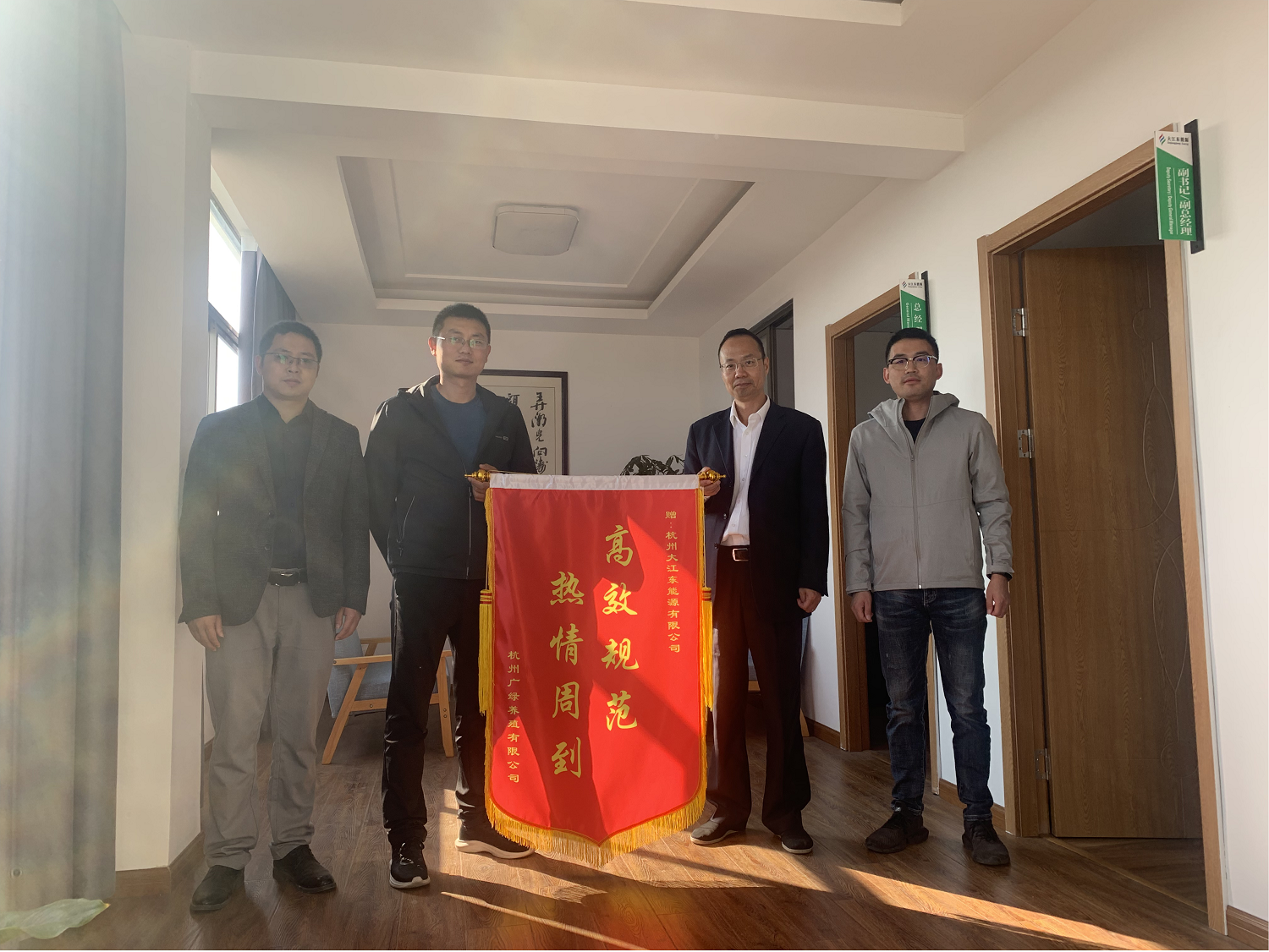 2020年11月4日下午,新希望集团大江东广绿养殖公司负责人单总专程来到大江东能源公司,将一面印着“高效规范 热情周到”的锦旗送到了公司副总经理方辉的手上,对公司在广绿养殖燃气扩容项目上提供的周到服务和专业态度表示感谢!
