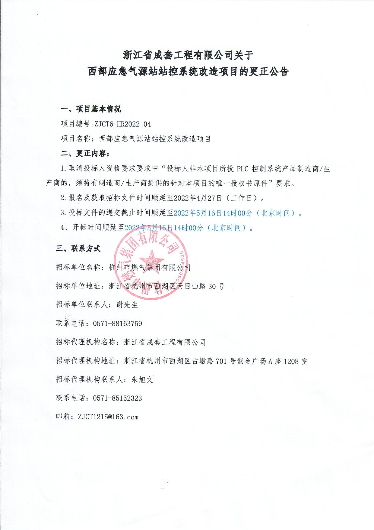 浙江省成套工程有限公司关于西部应急气源站站控系统改造项目的更正公告