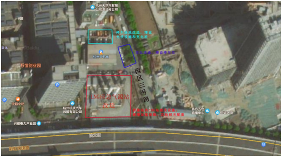 本项目为改造项目,位于杭州市滨江区已建滨江LNG应急气源站内,园区三号路(越城巷)以西、滨文路(彩虹大道高架)以北,具体详见项目位置图。本次改造内容包括拆除站内LNG站相关设施;新增加氢设施,1000kg/d(近期按500kg/d考虑,做好远期预留);新增20kw光伏发电设施、新增充电桩(6个120kw,双枪);其他相关配套工程(含地面破损修复、站房及泵房外立面粉刷、部分绿化改造、新建室外箱变及高防火墙等)。