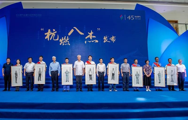 ▲朱金坤、蔡刚、胡征宇、范川、谢四海、何荣坤、陆瑞芬、谢胜才为“杭燃八杰”赠送八杰画像